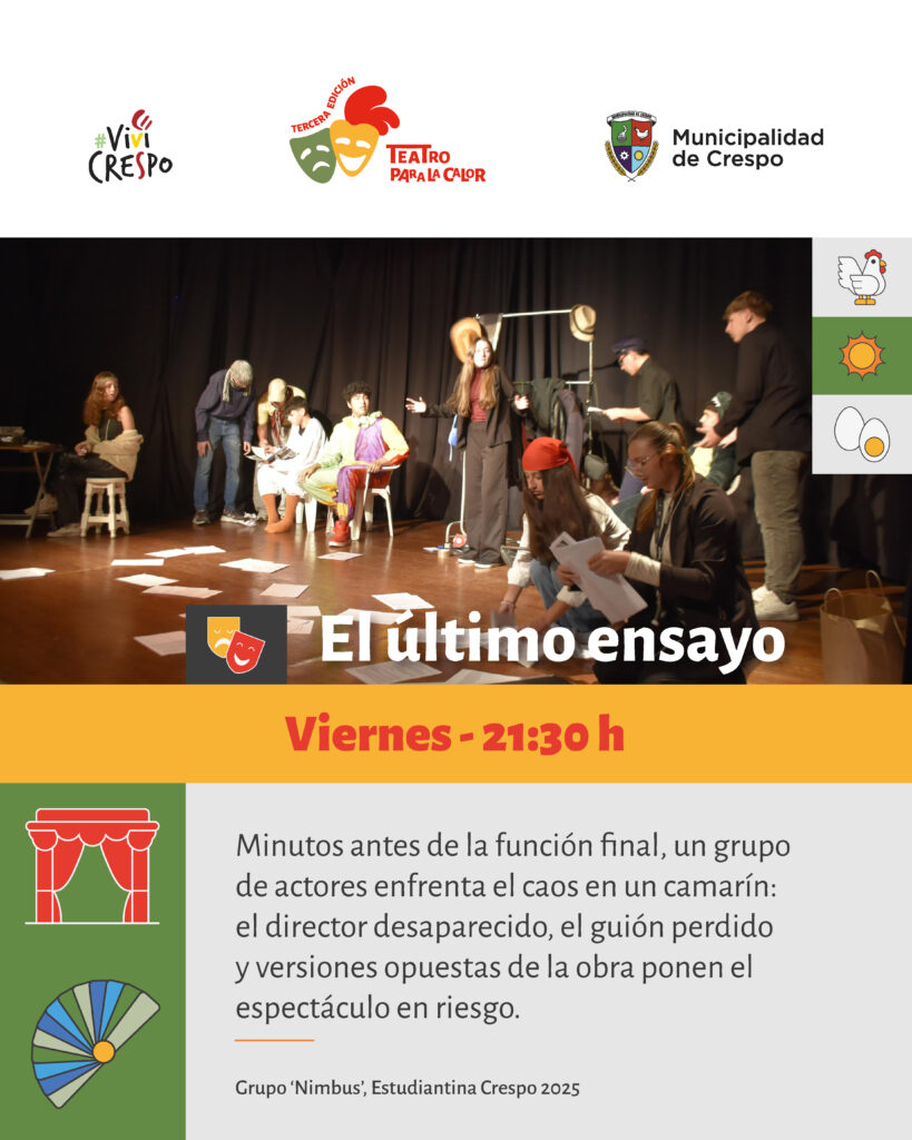 Sinopsis: Dicen que el teatro es magia… pero detrás de esa magia hay caos, nervios, olvidos, egos y discusiones. Hoy, en este camarín, un grupo de actores está a punto de vivir el momento más importante de su vida: la función final, la presentación frente a un público que lo espera todo. Solo hay un pequeño detalle: faltan quince minutos para que se abra el telón… y nada, absolutamente nada, está bajo control. El director ha desaparecido, el guion no aparece, y cada uno recuerda la obra de manera distinta. ¿Podrán unirse para salvar el espectáculo… o será el desastre más grande en la historia del teatro? Pasen y vean… el último ensayo.