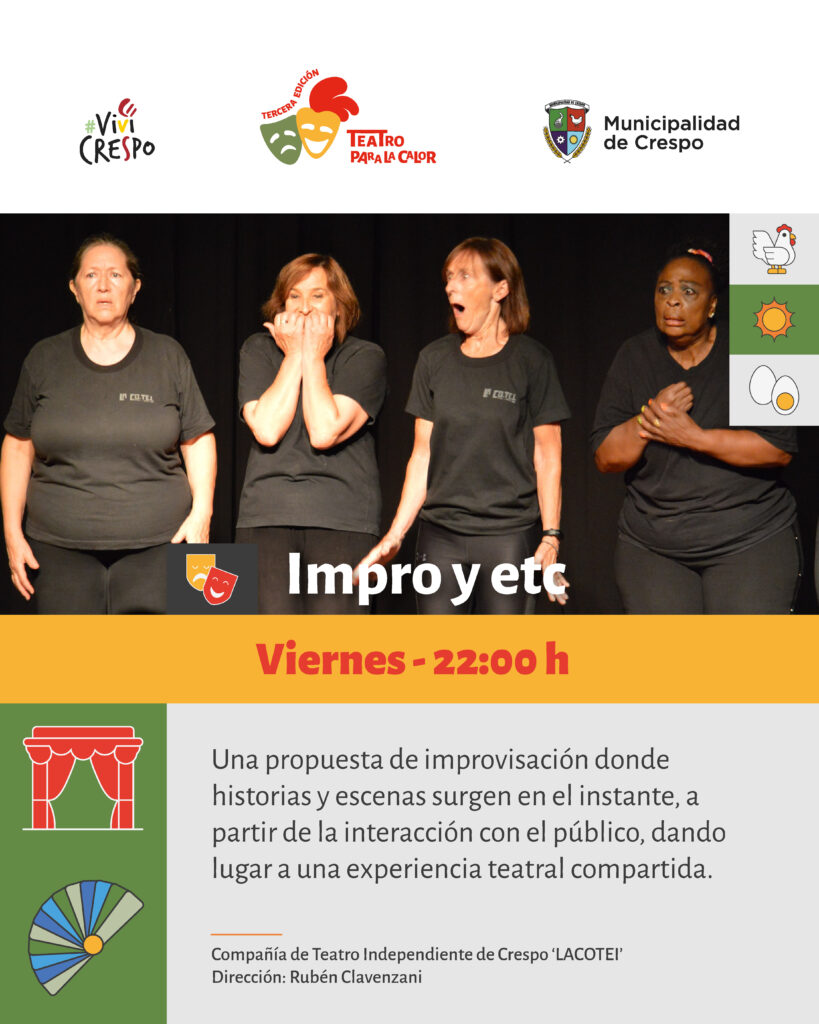 Sinopsis: Es una variedad de obras breves, de autores diversos y de producción de la Compañía de Teatro Independiente de Crespo (La-Co-Tei), cuyo eje vital es el humor. La Impro siempre es una sorpresa que se elabora en el momento, con la participación voluntaria del público.