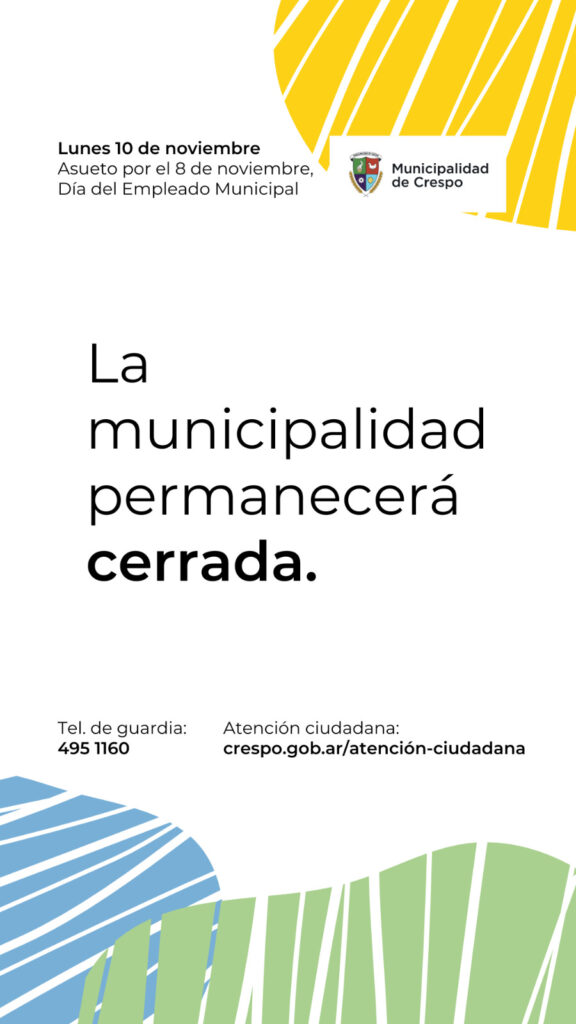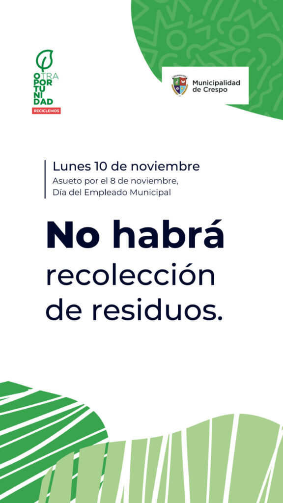 Es así que se informa que el 10 de noviembre no habrá atención al público en las dependencias de la Municipalidad de Crespo y no se prestará servicio de recolección de residuos domiciliarios, tanto en su fracción Orgánica (húmeda), como Inorgánica (seca) y Sanitaria (descartables usados). Por ello, se solicita a los vecinos colaborar evitando sacar los residuos a la vía pública durante ese día.