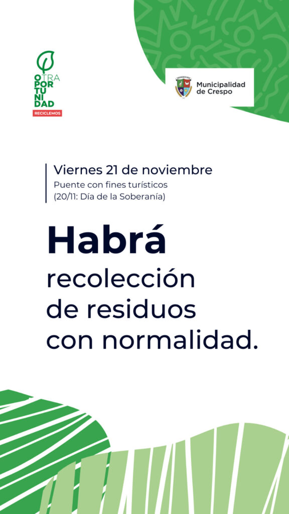 Con respecto al servicio de recolección de residuos domiciliarios separados en origen en orgánicos (húmedos), inorgánicos (secos) y sanitarios, se trabajará con normalidad, desde las 6:00, con la premisa de mantener limpia y ordenada nuestra ciudad como nos gusta a los crespenses.