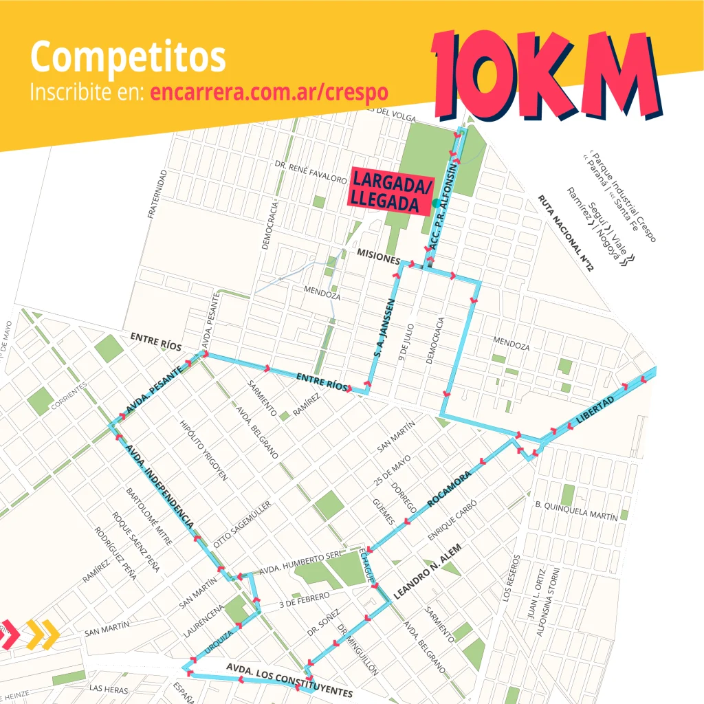 Arrancará en Acceso Alfonsín e irá uniendo las siguientes calles: Misiones, Kaehler, Entre Ríos, Libertad, Los Reseros, Carbó, Blas Parera, Rocamora, Pasaje Echagüe, Avda. Belgrano, Alem, Avda. Independencia, Avda. Los Constituyentes, Urquiza, Avda. Independencia, Avda. Tratado del Pilar, Avda. Humberto Seri, Avda. Independencia, Avda. Esteban Pesante, Entre Ríos, San Arnoldo Janssen, Misiones, Acceso Alfonsín hasta los torreones del pórtico donde realizarán la rotonda y encararán los últimos metros de carrera hasta la llegada.