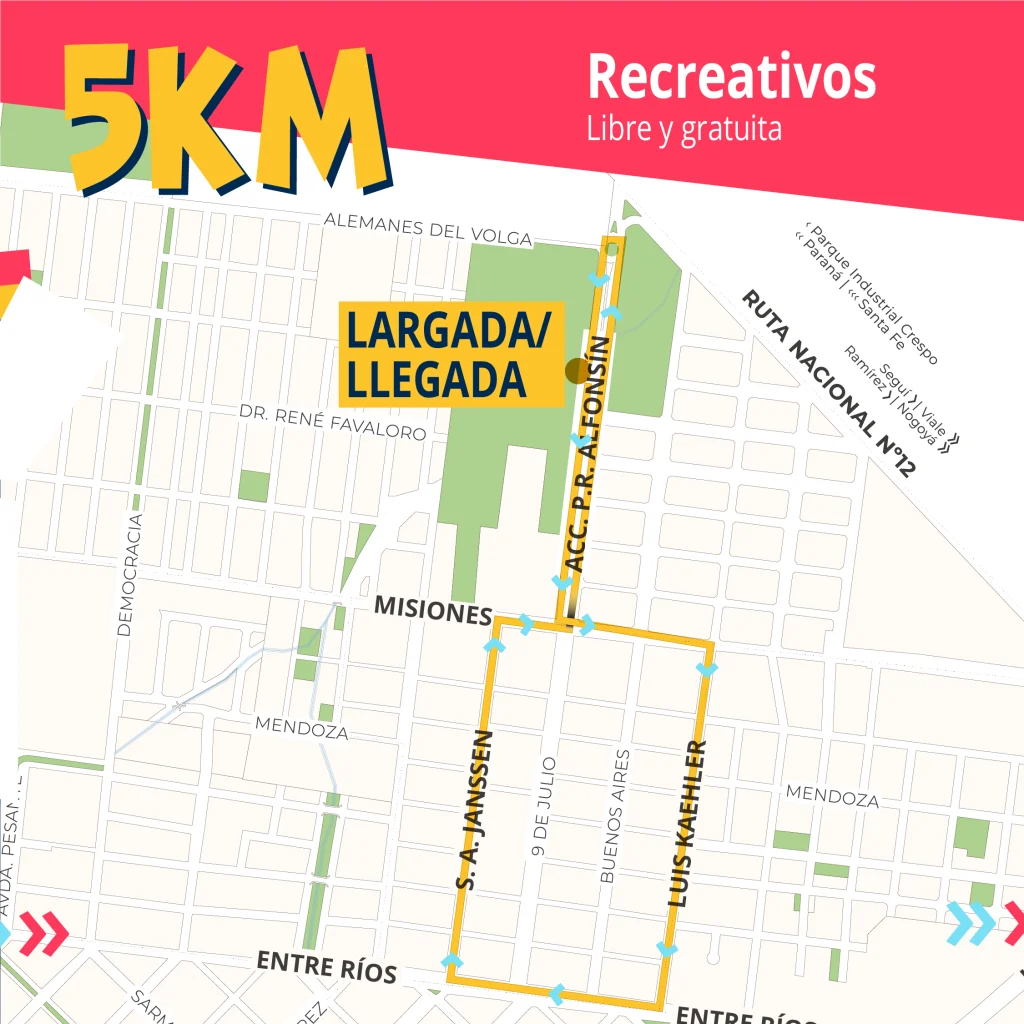 La largada será en conjunto en el Acceso Alfonsín, para luego ir uniendo estas calles: Misiones, Kaehler, Entre Ríos, San Arnoldo Janssen, Misiones y Acceso Alfonsín hasta los torreones del pórtico donde realizarán la rotonda y afrontarán los últimos metros hasta la llegada.