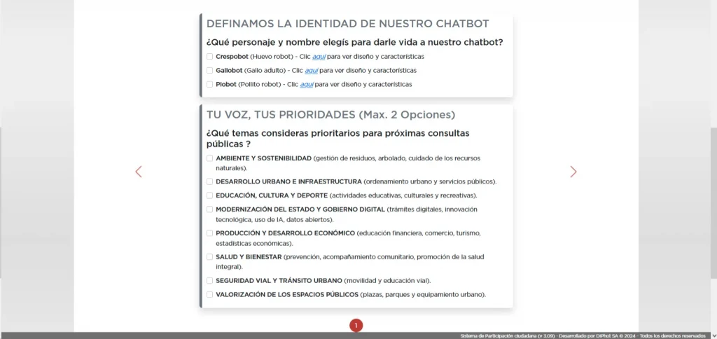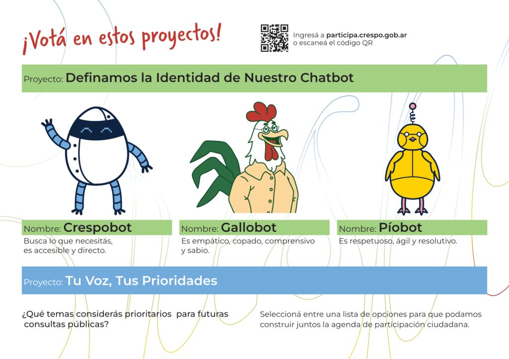 Actualmente, se encuentra abierta la campaña ‘Definamos la identidad de nuestro chatbot’, en la que la comunidad puede elegir el personaje y nombre que representará al asistente virtual municipal. Las opciones disponibles son Crespobot (Huevo robot), Gallobot (Gallo adulto) y Piobot (Pollito robot), cada una acompañada de su diseño y características.