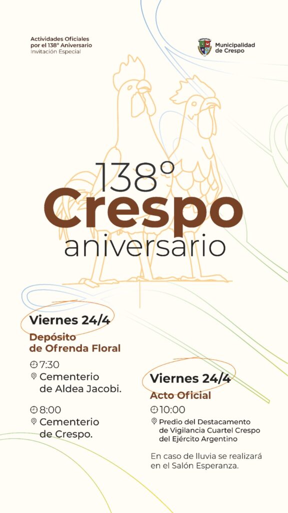 Este viernes 24 de abril, desde las 10:00 horas, se llevará adelante el Acto Protocolar Oficial por el ‘138º Aniversario de la Ciudad de Crespo’. Será en el predio del Destacamento de Vigilancia Cuartel Crespo del Ejército Argentino.
