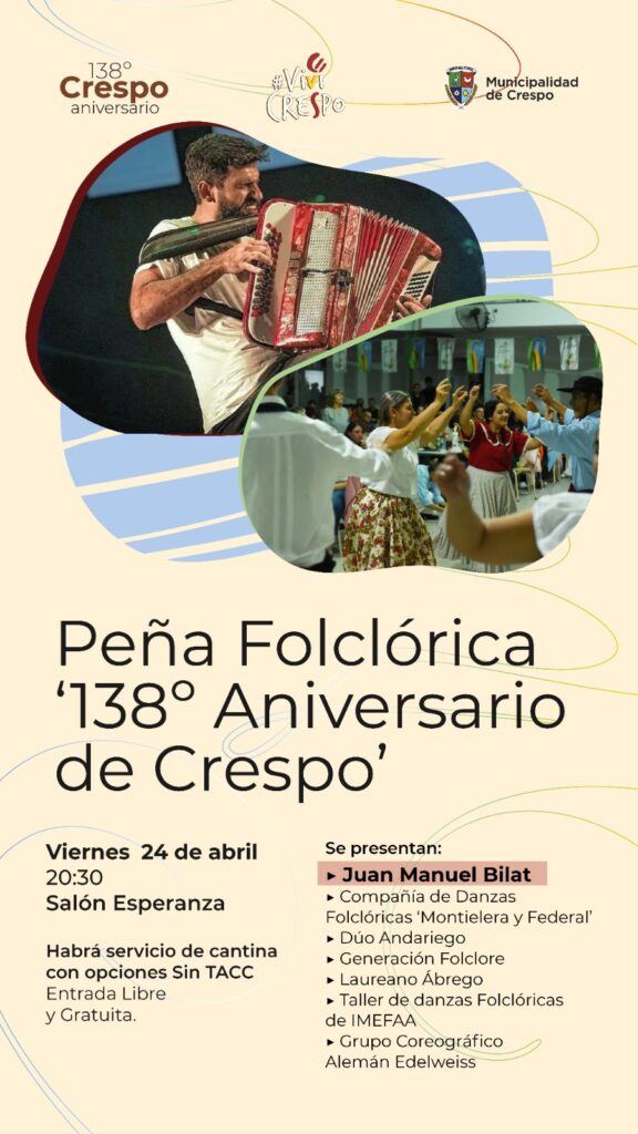 La Peña Folclórica ‘138º Aniversario de la Ciudad de Crespo’ se realizará este viernes 24 de abril, desde las 20:30 horas, en el ‘Salón Esperanza’ de la Iglesia Evangélica del Río de la Plata.