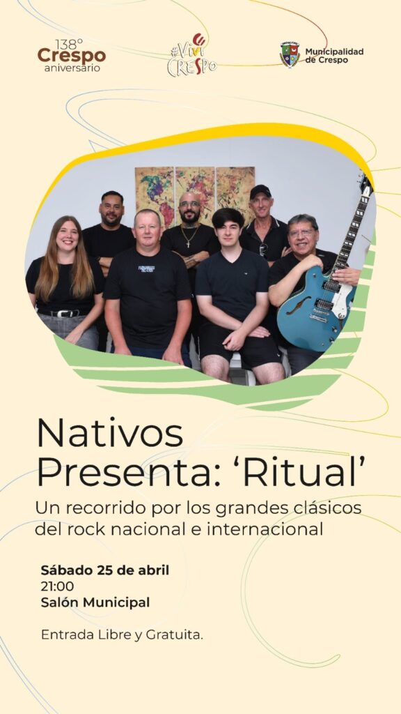 El recital ‘Ritual’ es una propuesta musical pensada para disfrutar en comunidad, con entrada libre y gratuita. El grupo Proyecto Nativos ofrecerá un recorrido por los grandes clásicos del rock nacional e internacional, reviviendo canciones que marcaron distintas generaciones y que siguen vigentes en el tiempo.