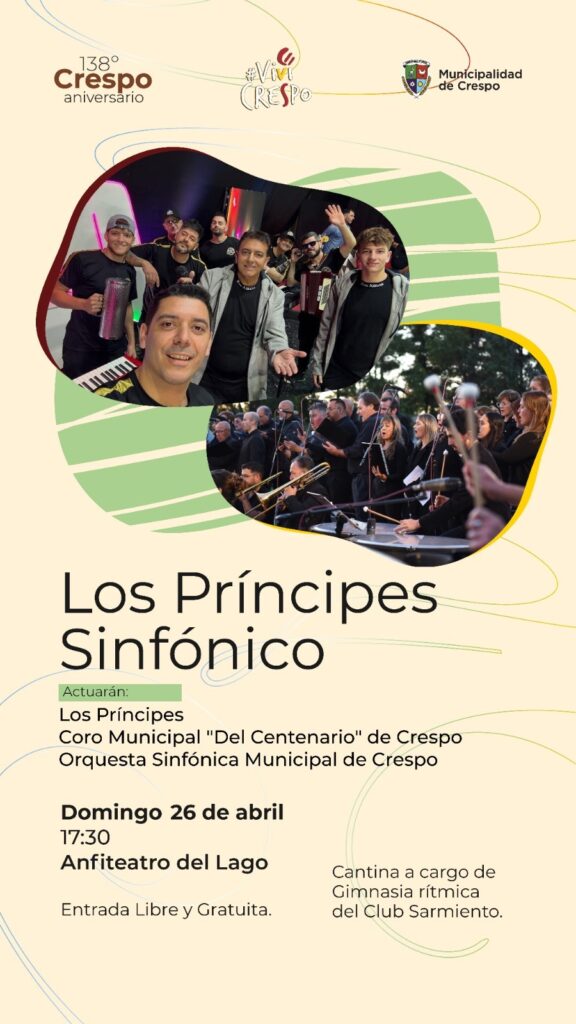 En la continuidad de la cartelera por la celebración del ‘138º Aniversario de la Ciudad de Crespo’, festejaremos con el show musical ‘Los Príncipes Sinfónico’. Será el domingo 26 de abril, desde las 17:30 horas, en el Anfiteatro del Lago. Actividad gratuita y abierta a toda la comunidad.