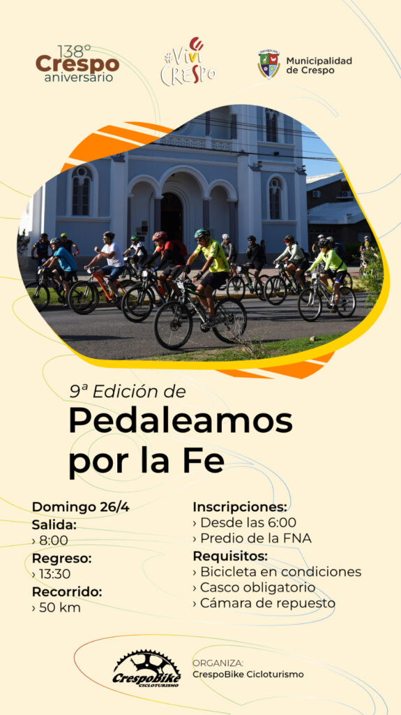 Bajo la organización de CrespoBike Cicloturismo se llevará a cabo una nueva edición de ‘Pedaleamos por la Fe’. Será el domingo 26 de abril, con epicentro en el Predio Ferial de la Fiesta Nacional de la Avicultura.