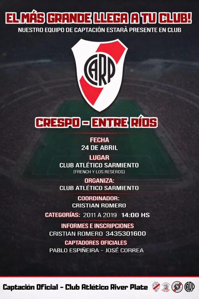 -Fútbol: Bajo la consigna ‘El más grande llega a tu club’, el equipo oficial de captación de River Plate estará en Sarmiento este viernes 24 de abril. La prueba será para futbolistas categorías 2011 a 2019. Se realizará desde las 14:00, en el predio ‘Mario Trembecki’ ubicado en French y Los Reseros. Para más información comunicarse al teléfono: 3435 – 301600.
