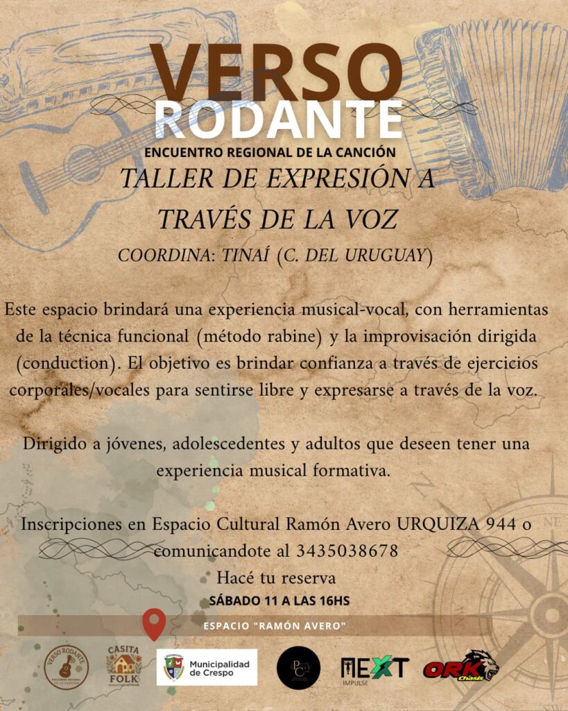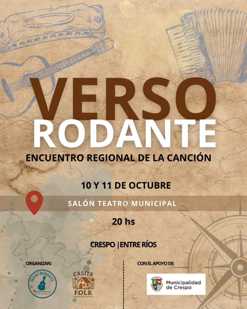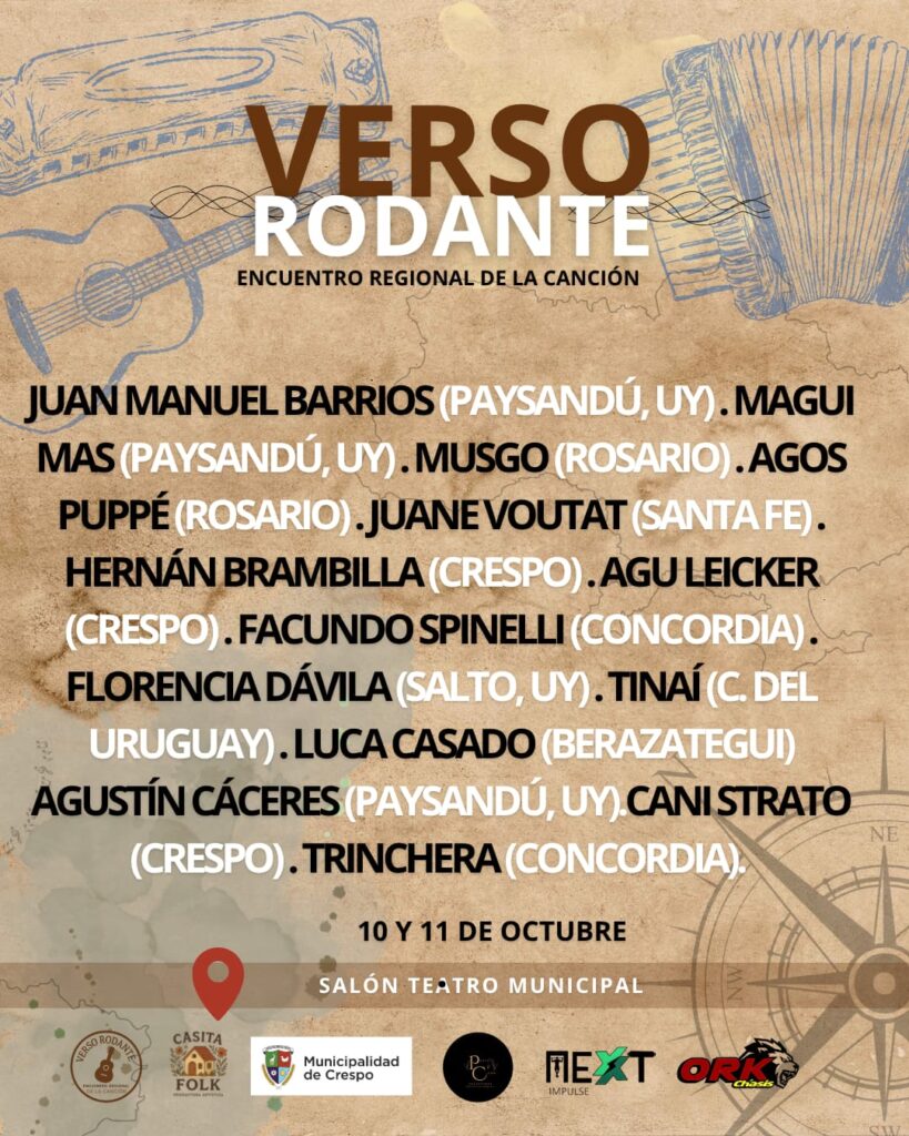 El ‘Encuentro Regional de la Canción’ reunirá a diversos cantautores de la región, el viernes 10 y sábado 11 de octubre, desde las 20:00. Contará con la presencia de artistas en escena ofreciendo conciertos acústicos: Juan Manuel Barrios (Paysandú), Musgo (Rosario), Juane Voutat (Santa Fe), Trinchera (Concordia), Tinaí (Concepción del Uruguay), Agu Leicker (Crespo), Florencia Dávila (Salto), Hernán Brambilla (Crespo), Magui Más (Paysandú), Cani Strato (Crespo), Luca David Casado (Bs. As.) Agos Puppé (Rosario), Facundo Spinelli (Concordia) y Agustín Cáceres (Paysandú). La actividad es libre y gratuita.