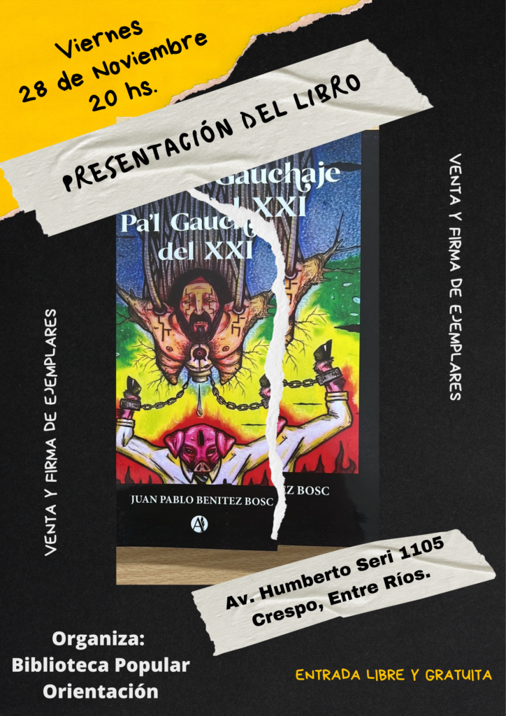 El autor nogoyaense Juan Pablo Benítez Bosc exhibirá su primera obra literaria publicada. Será este viernes 28 de noviembre a las 20:00, en la Biblioteca Popular ‘Orientación’. En la oportunidad presentará el libro Pa’l Gauchaje del XXI. El evento está enmarcado en la agenda cultural por el mes de la Tradición.