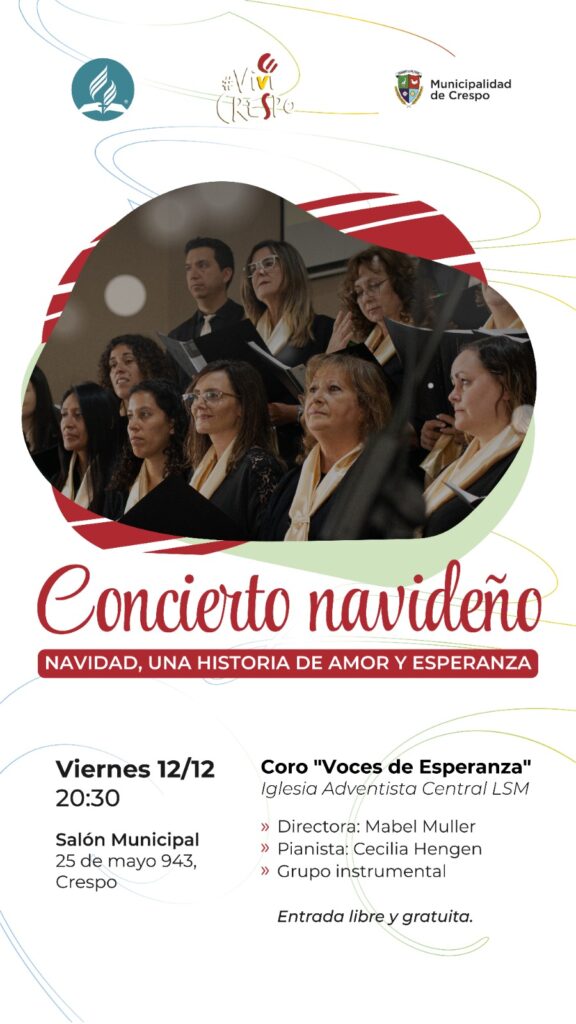 El Coro ‘Voces de Esperanza’ de la Iglesia Adventista Central Libertador San Martín, se presentará en Crespo para realizar el Concierto Navideño: ‘Navidad, una historia de amor y esperanza’.